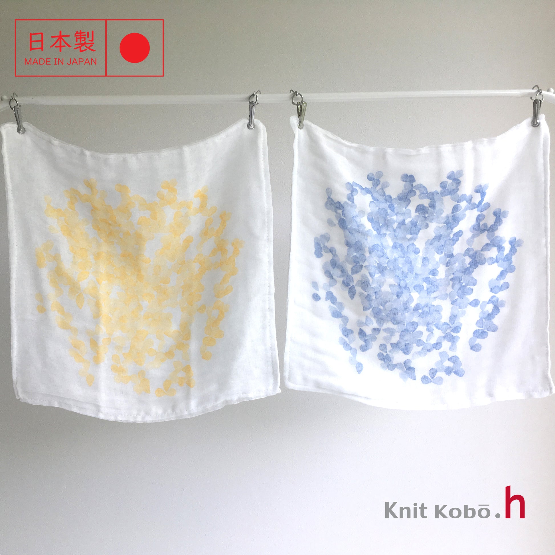 This gauze towel showcases a beautiful design with soft, blue/yellow floral patterns that resemble a bouquet at the center. The flowers are delicately blended into the white background, creating a gentle and elegant appearance. The artwork is crafted using a unique stamping technique to illustrate the overlapping petals, adding a touch of sophistication and charm to the piece.