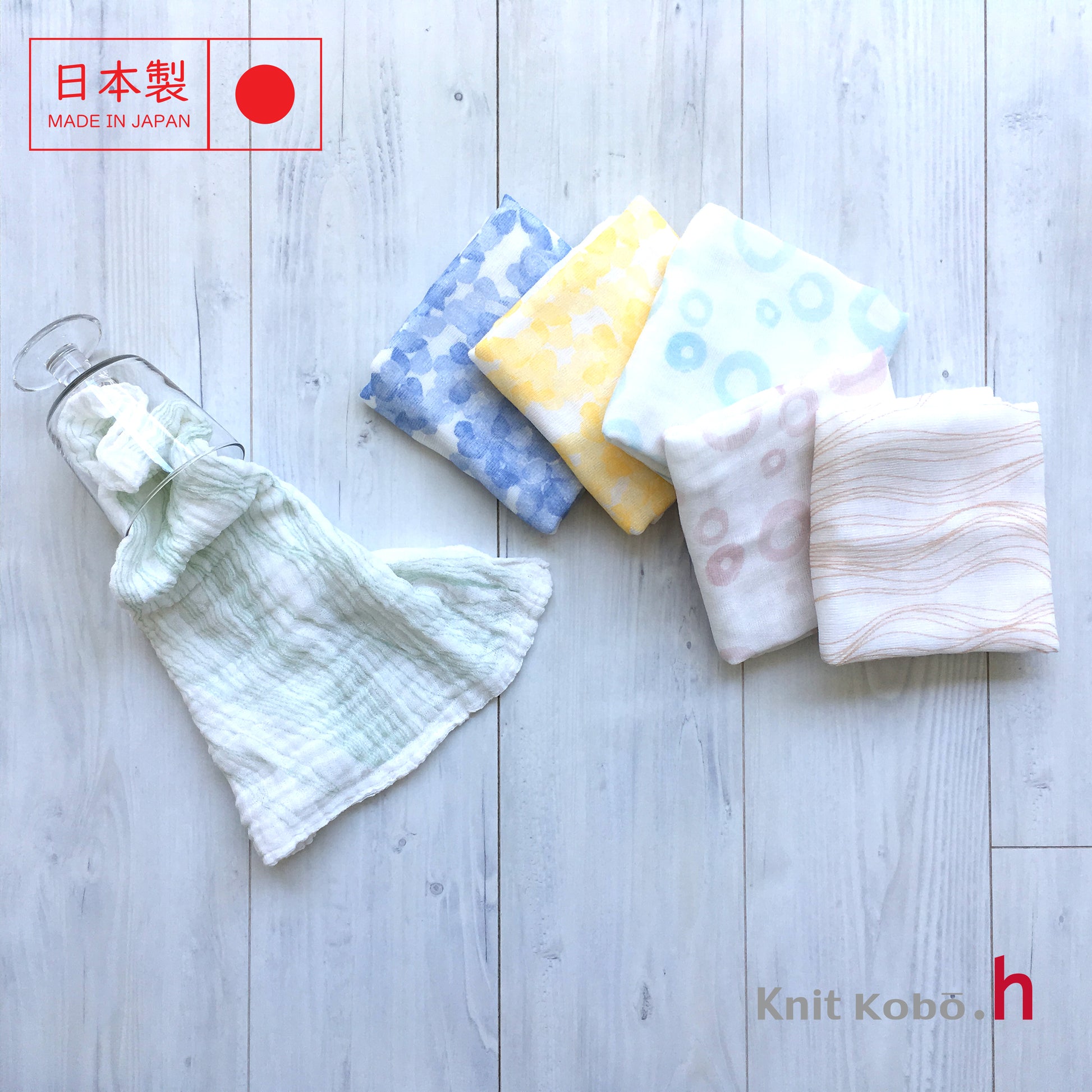 This gauze towel, named "Mizutama," features a playful design of light blue/pink circles scattered across a white background. The pattern resembles water droplets, giving the towel a fresh and calming appearance.