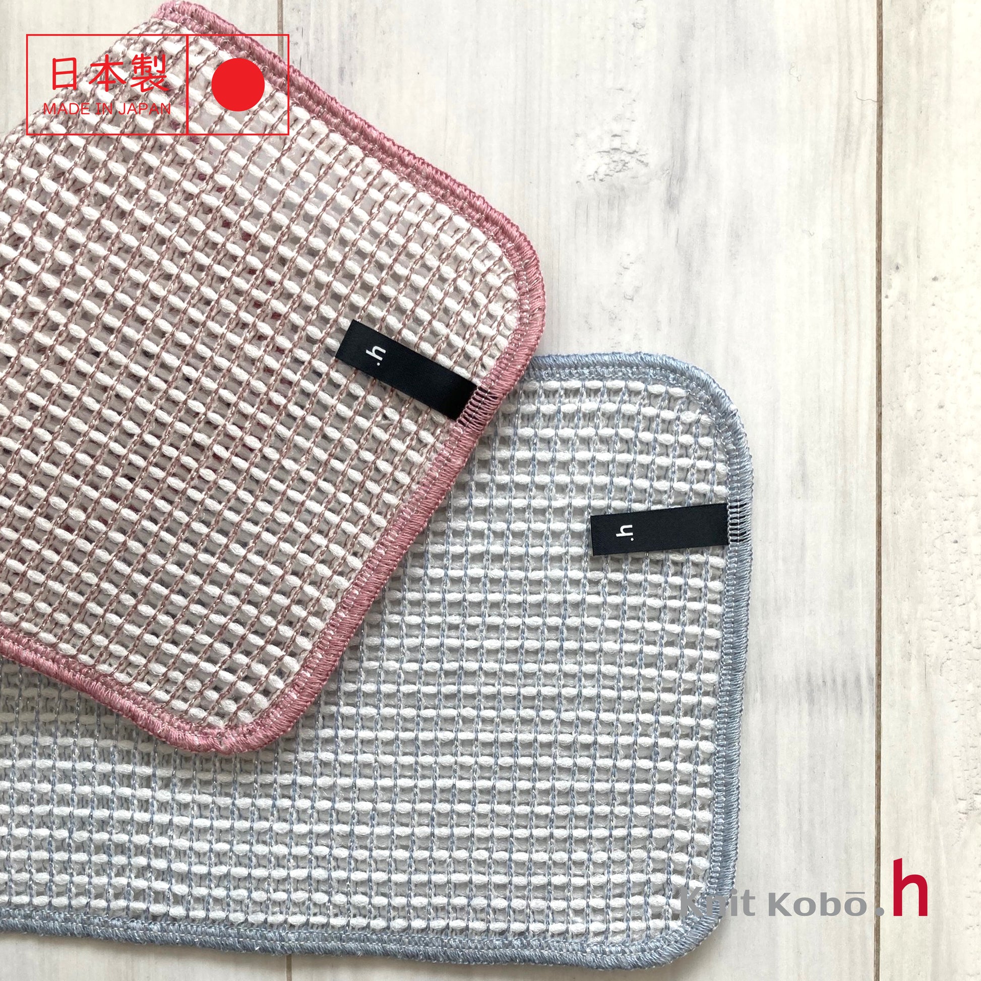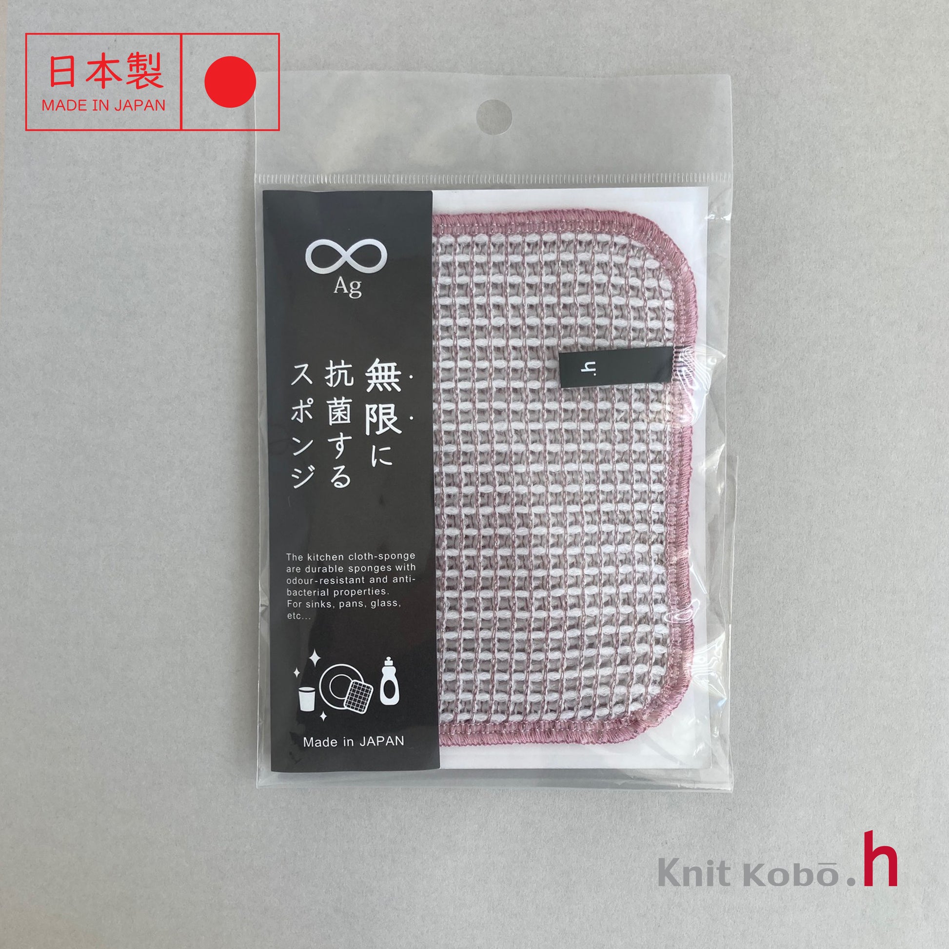 The sponge is made by sewing together two layers of coarsely knitted fabric to add volume. The sponge is elastic and easy to grip, allowing thorough cleaning of items like the bottoms of narrow glasses or the corners of lunch boxes by feeling with the fingertips.