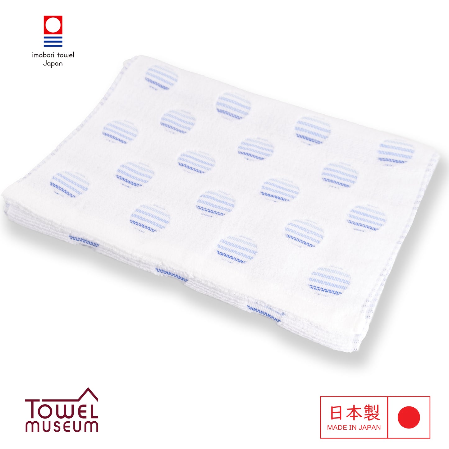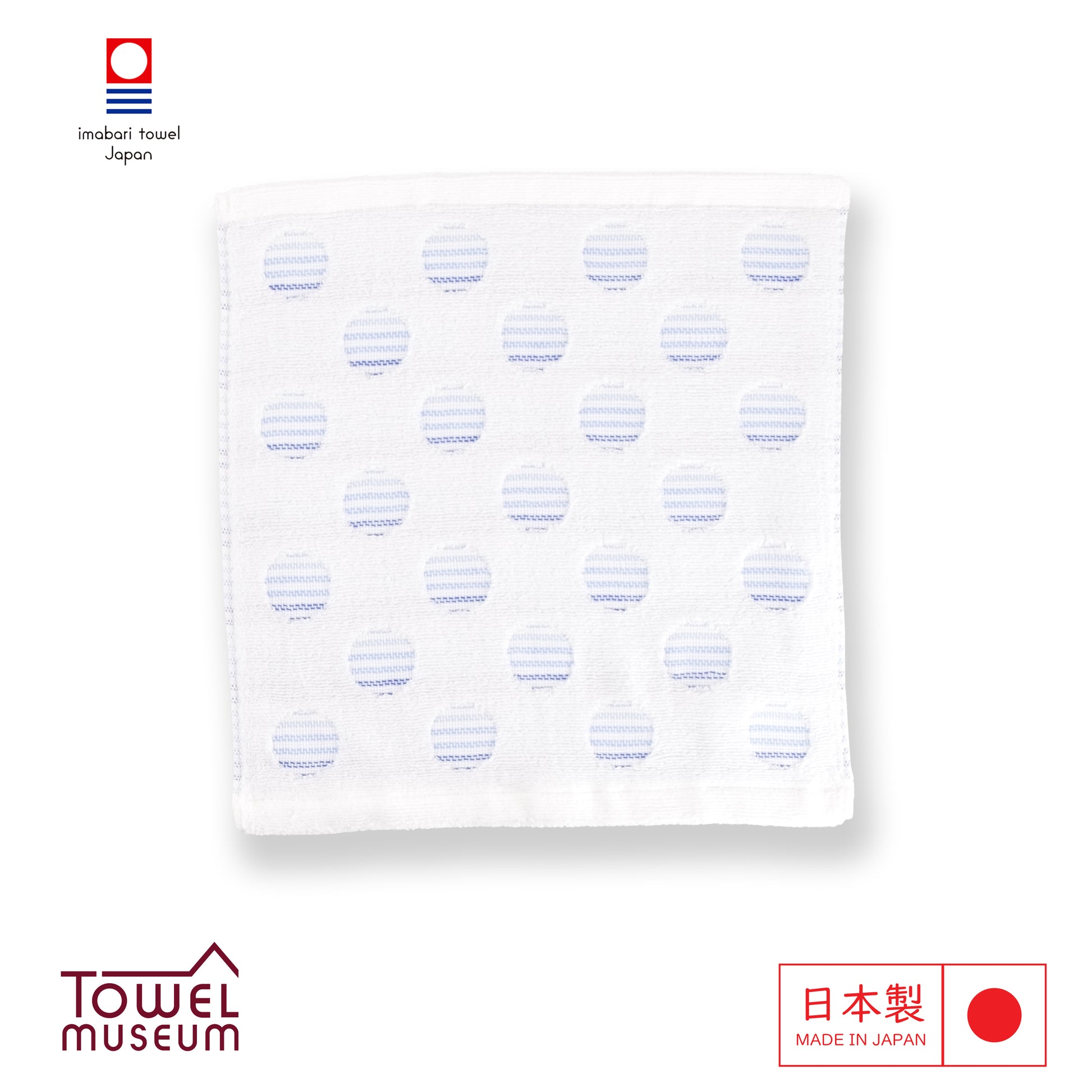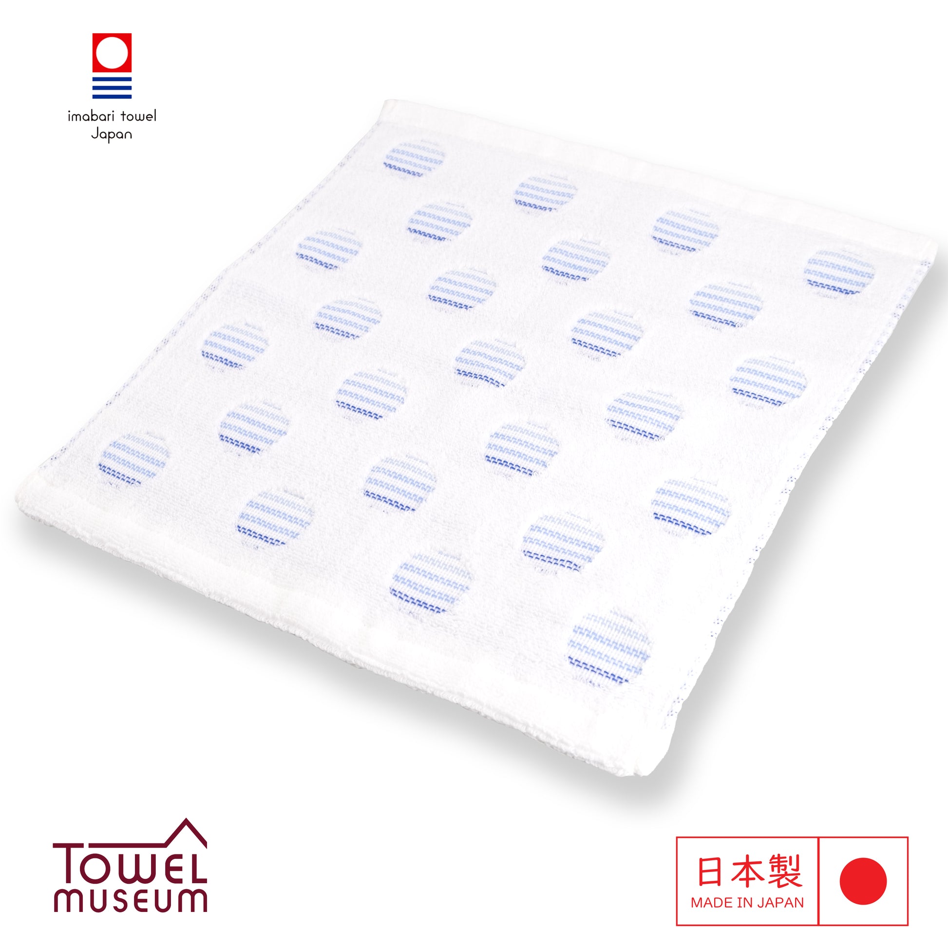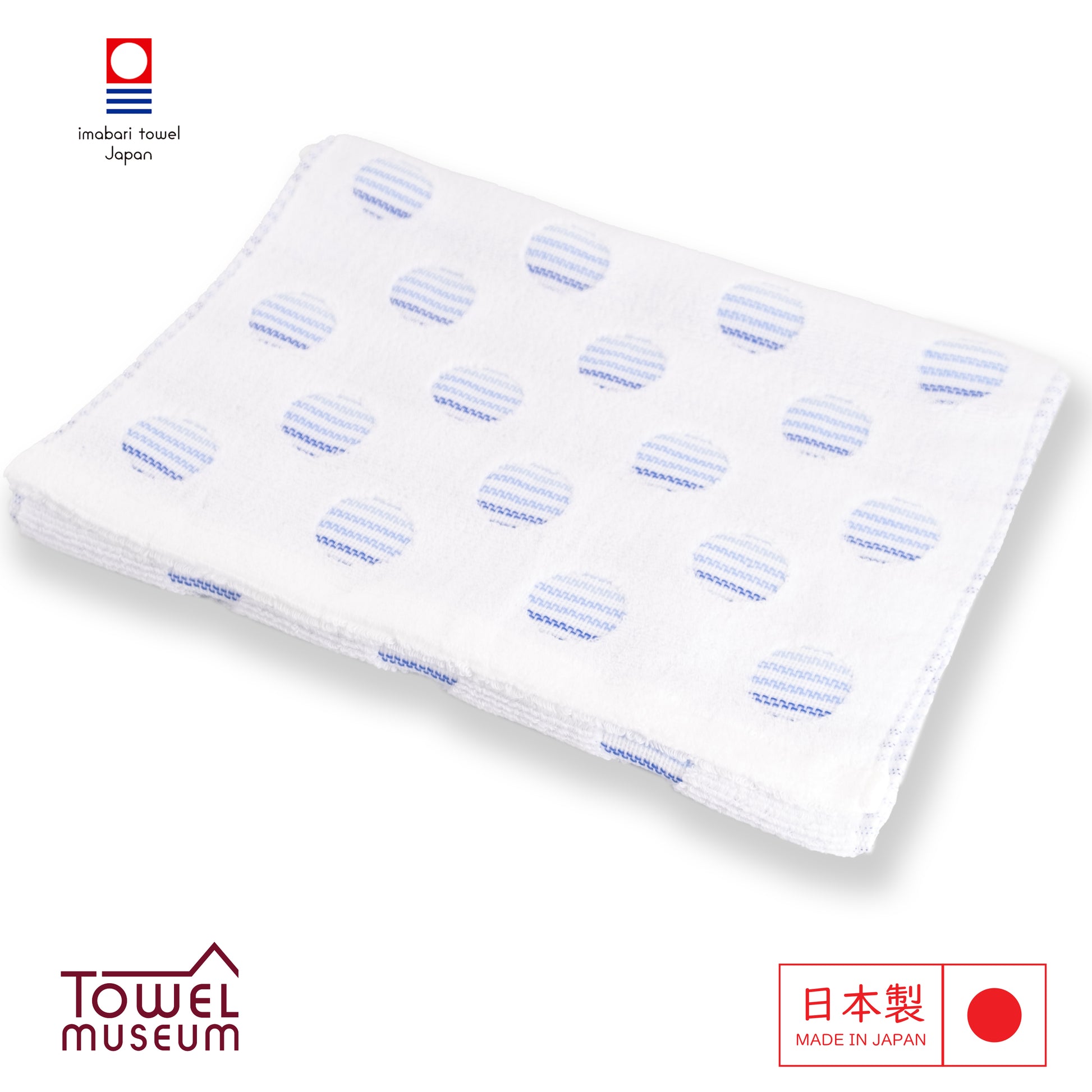 Brighten your day with the Imabari Style Fluffy Towel. This charming towel features a delightful design of blue and white striped circles scattered across a soft white background. The unique pattern adds a touch of playfulness and elegance, to your daily life.