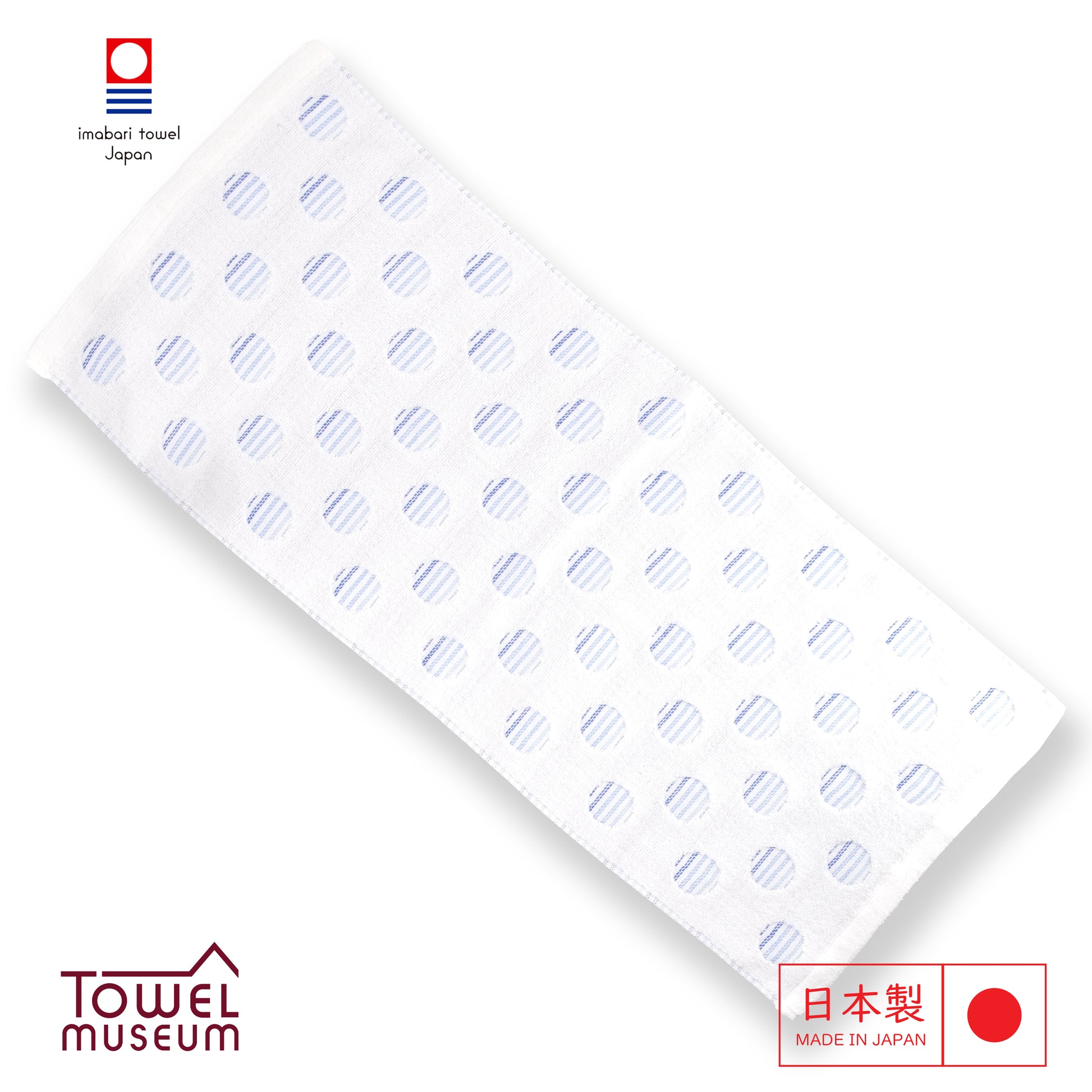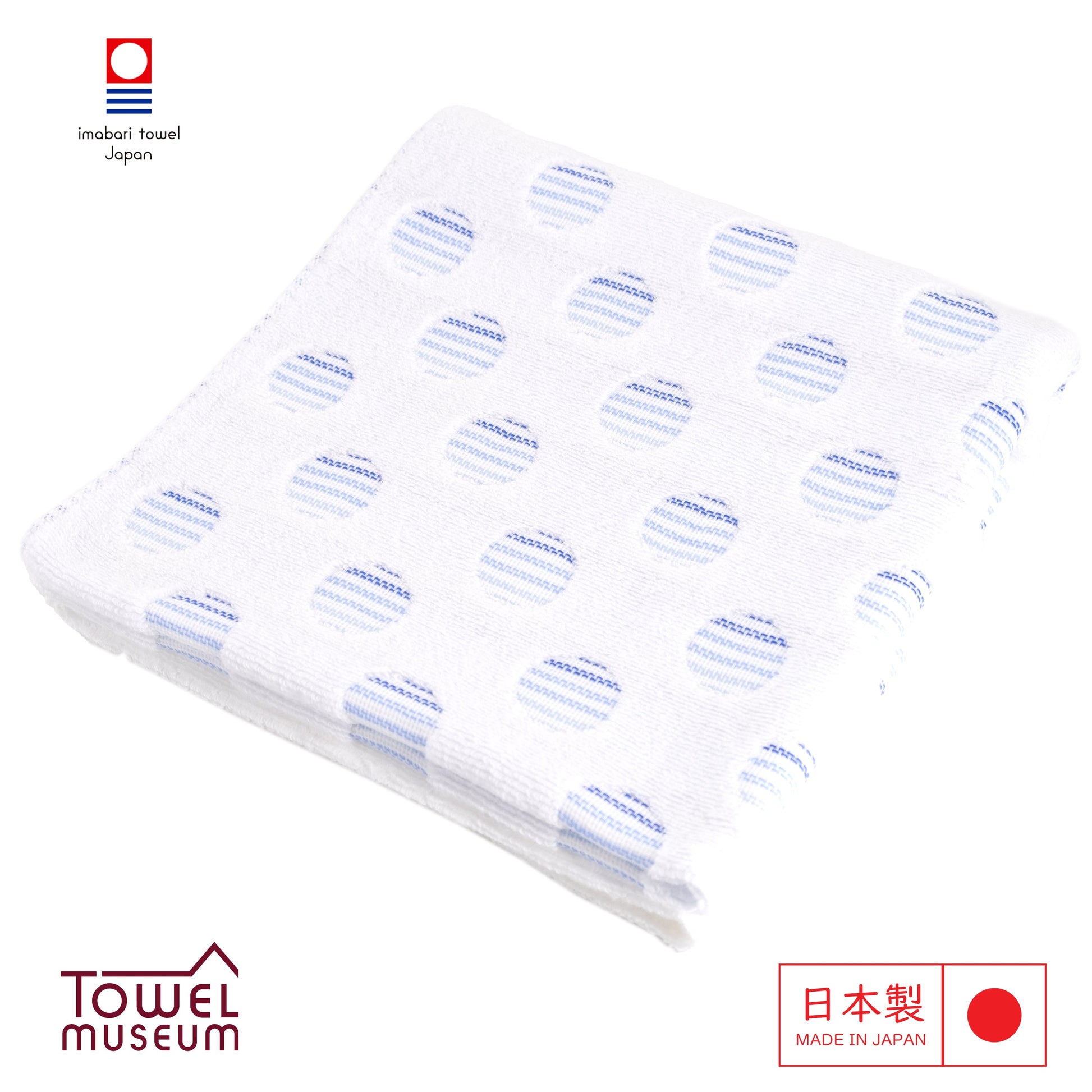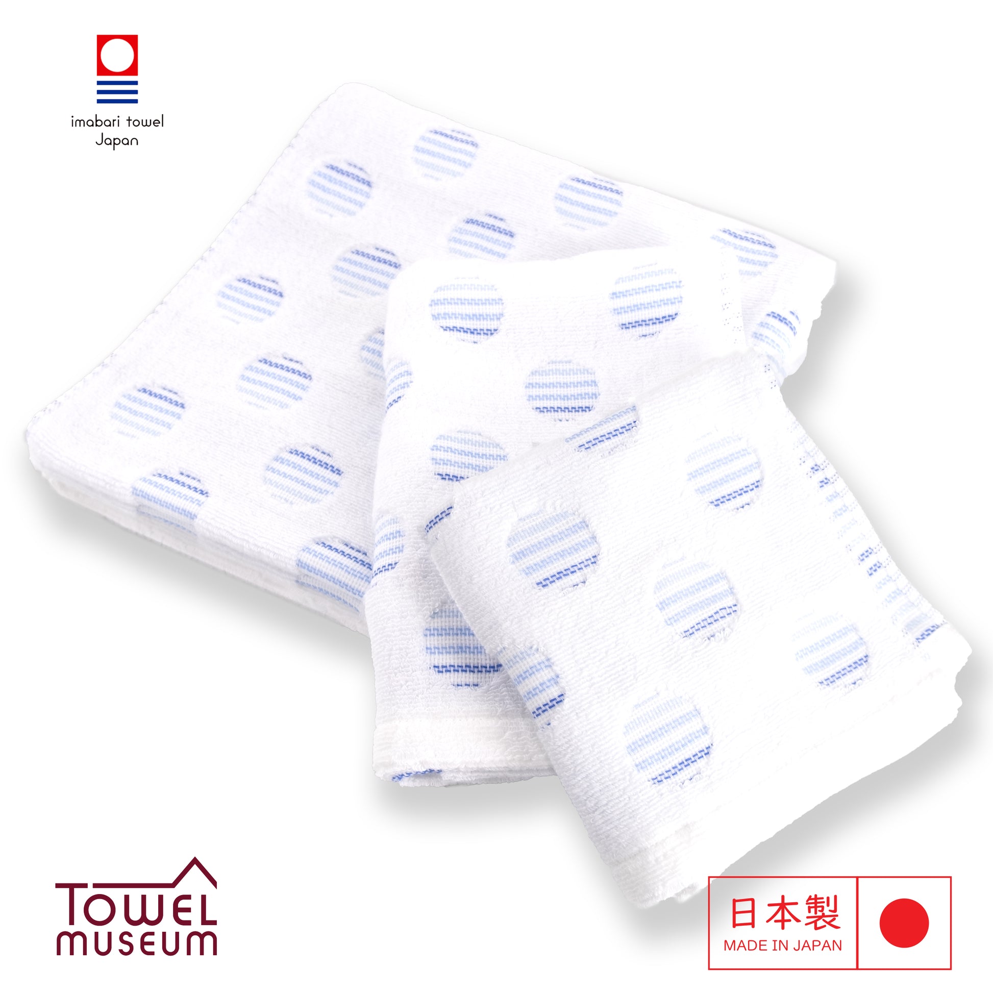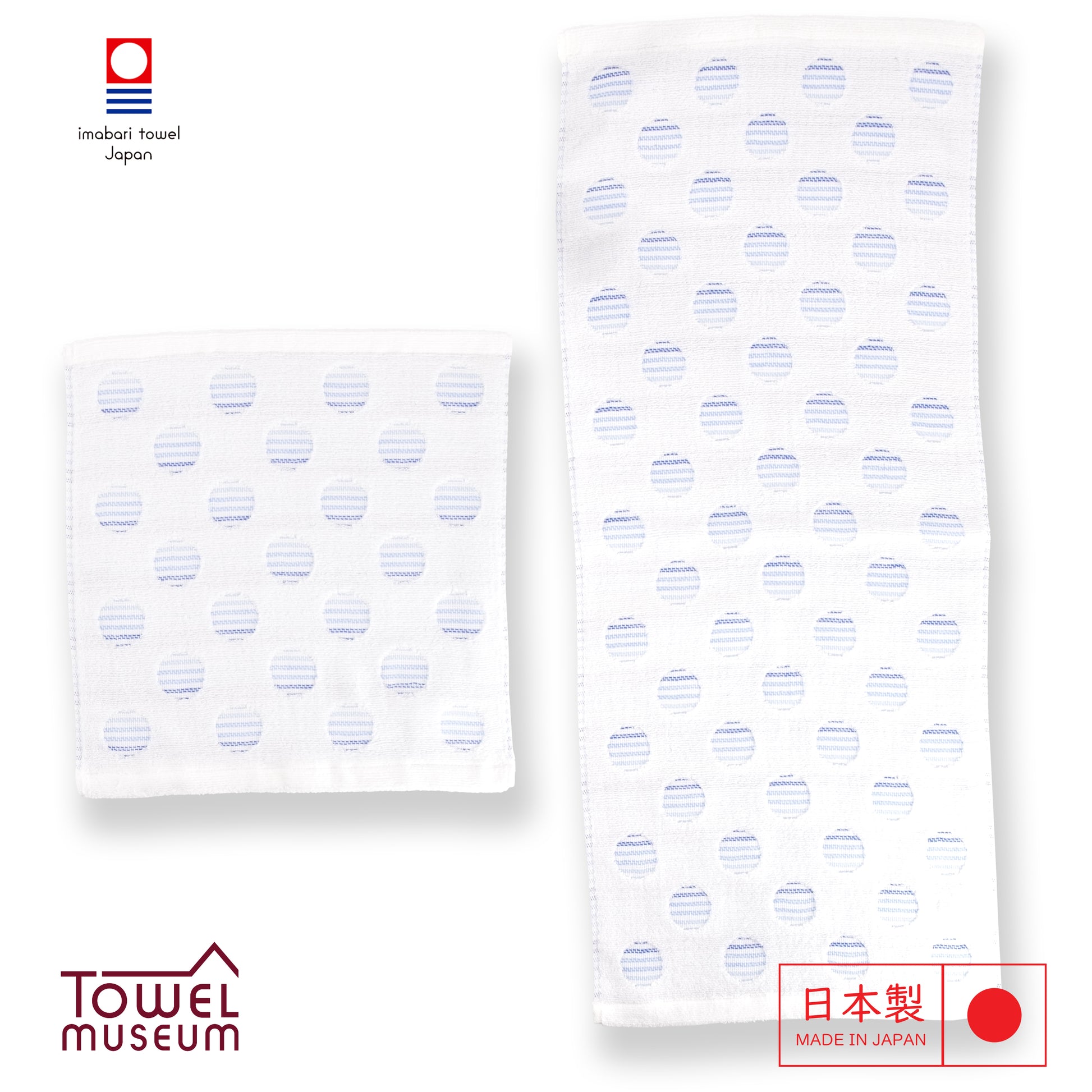 Brighten your day with the Imabari Style Fluffy Towel. This charming towel features a delightful design of blue and white striped circles scattered across a soft white background. The unique pattern adds a touch of playfulness and elegance, to your daily life.