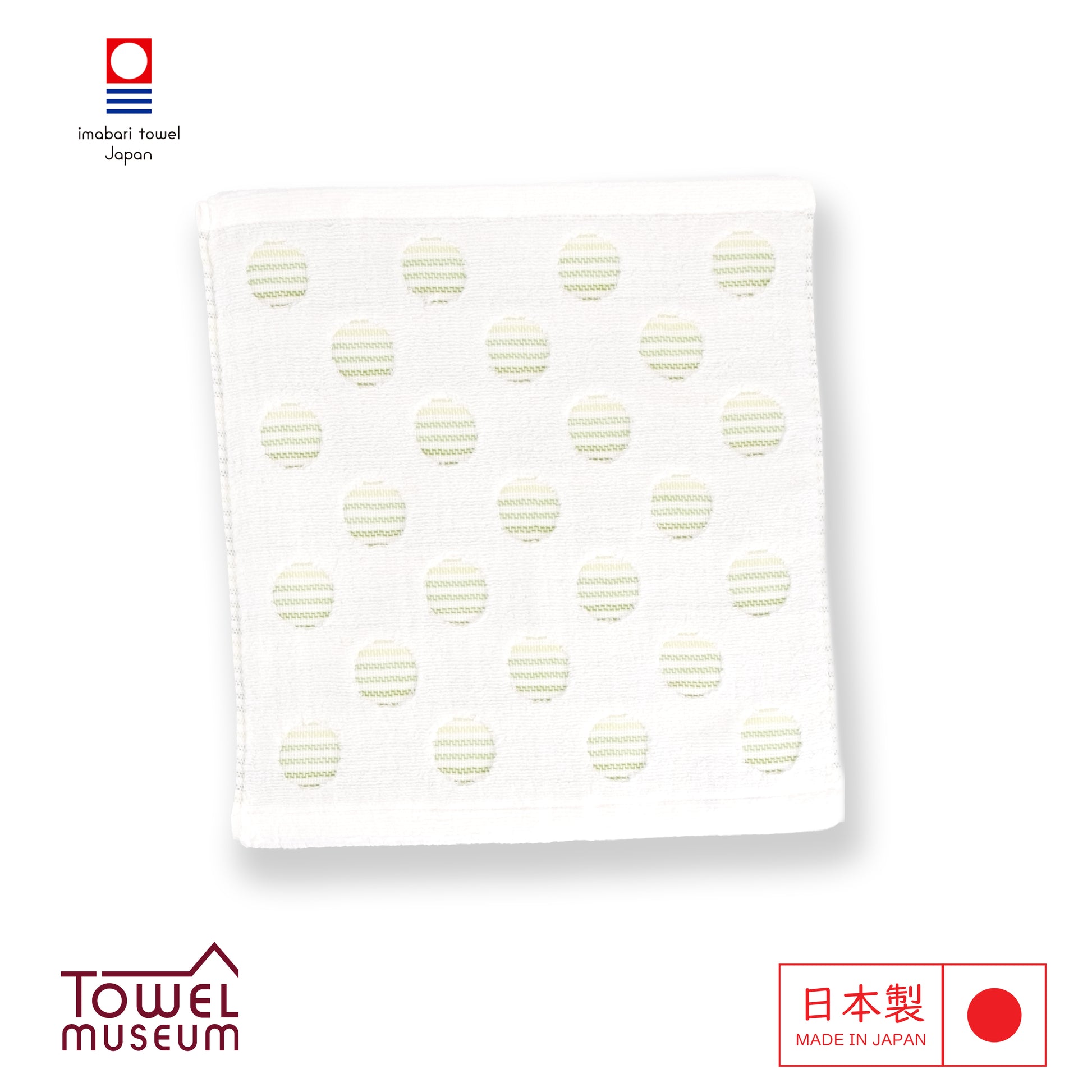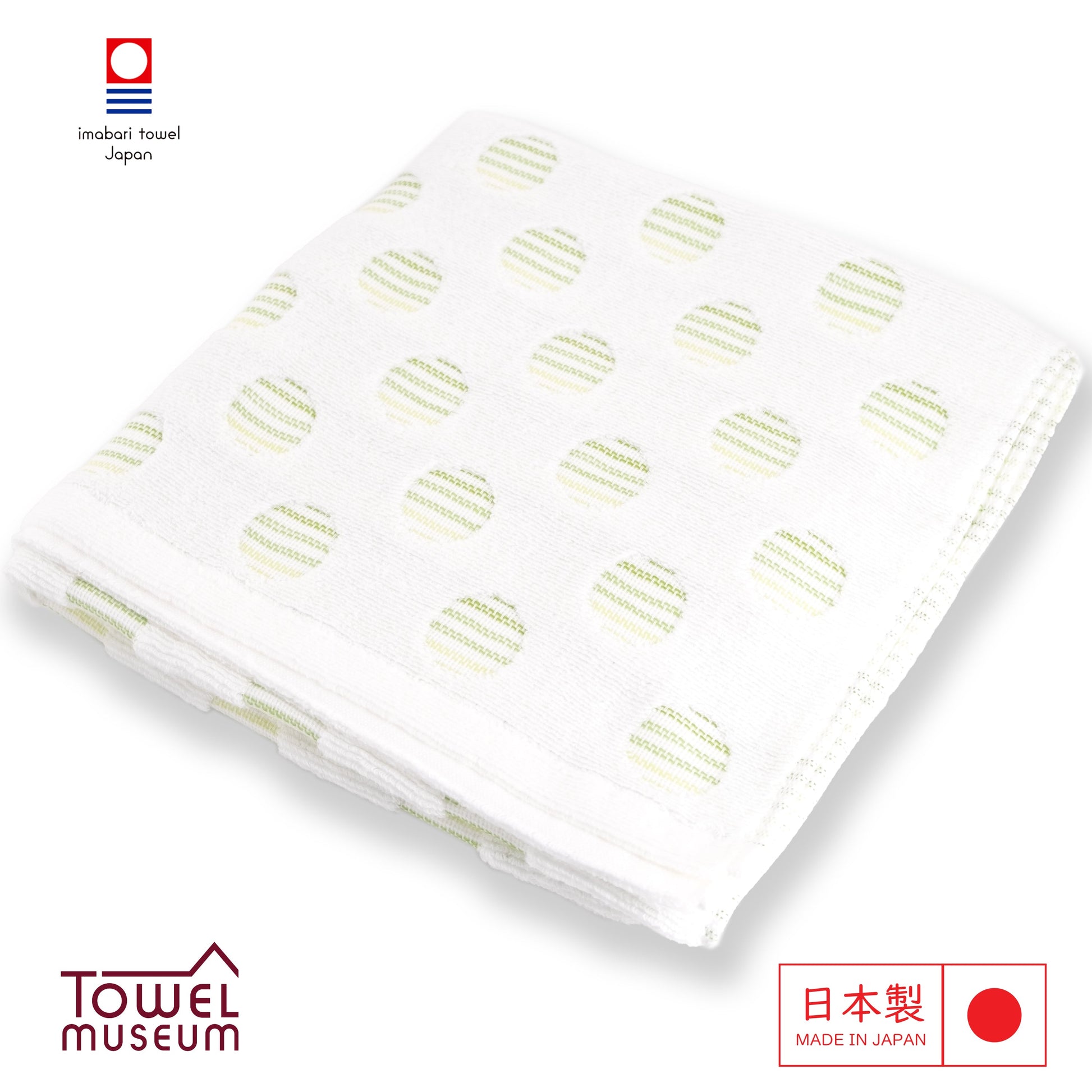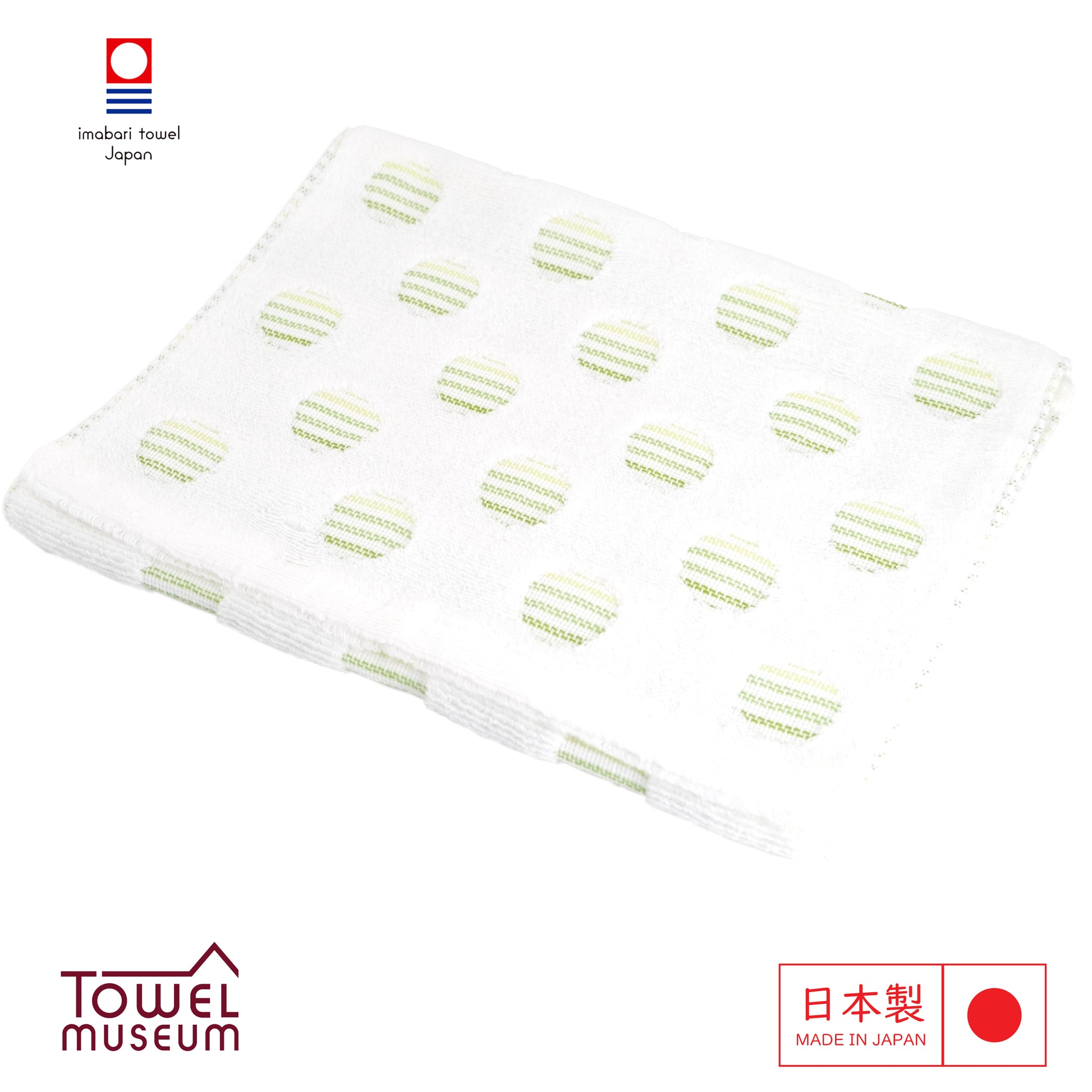 Brighten your day with the Imabari Style Fluffy Towel. This charming towel features a delightful design of green and white striped circles scattered across a soft white background. The unique pattern adds a touch of playfulness and elegance, to your daily life.