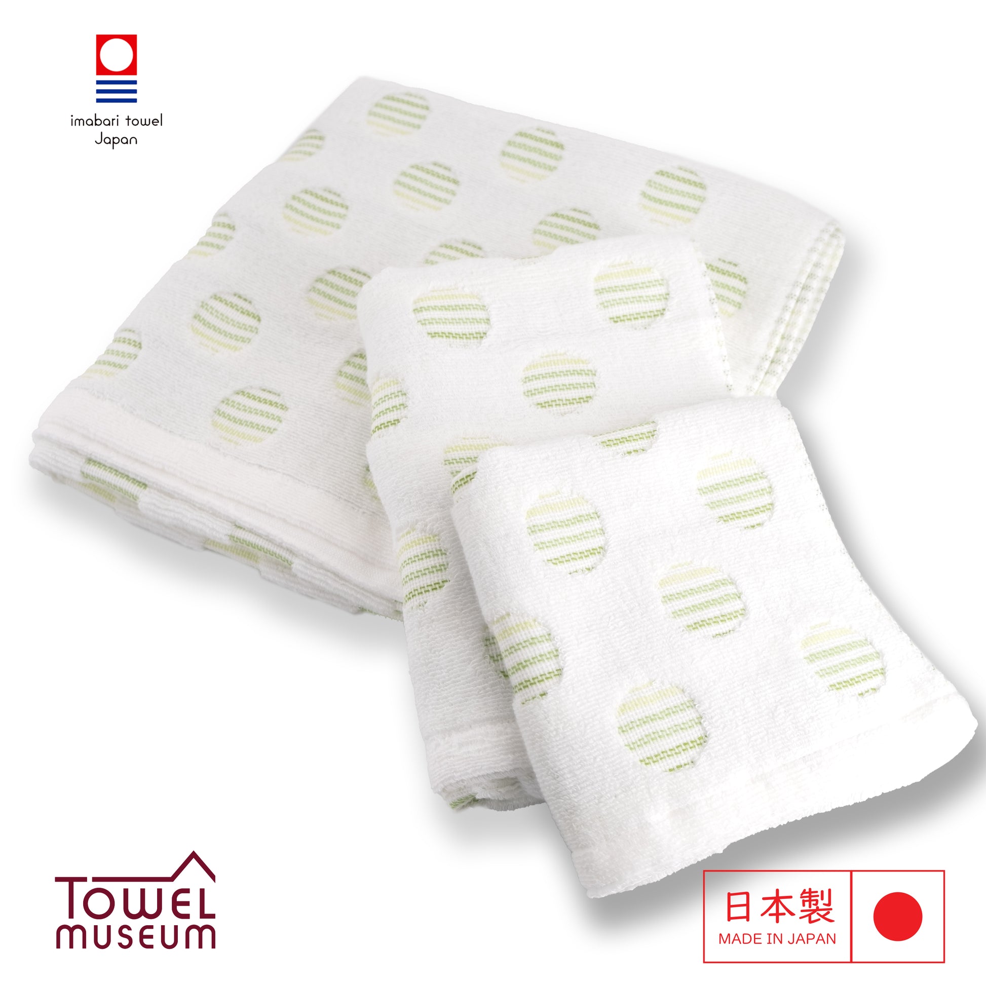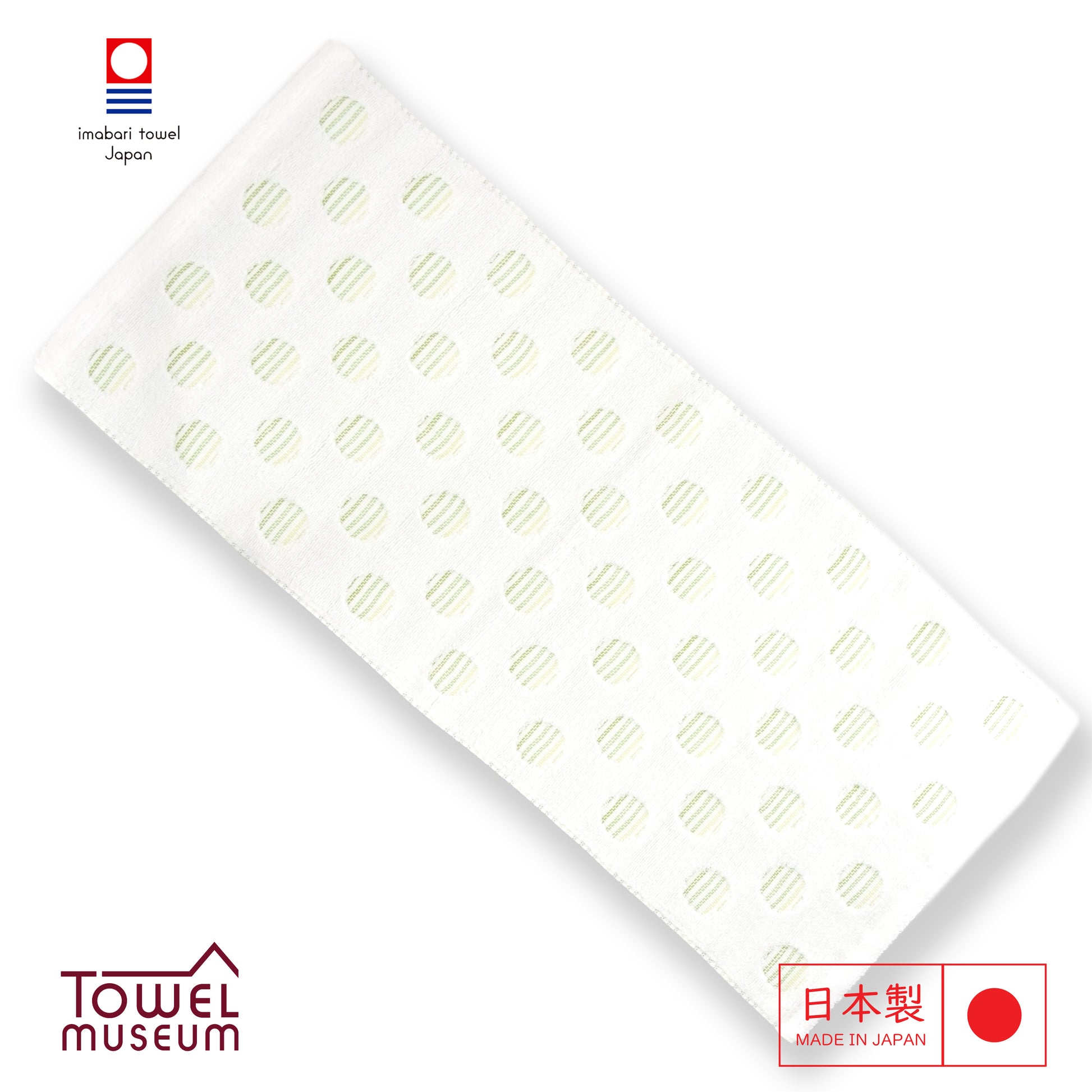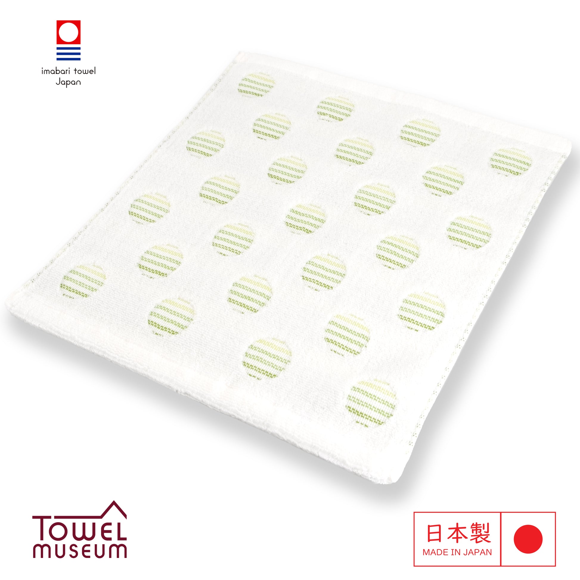 Brighten your day with the Imabari Style Fluffy Towel. This charming towel features a delightful design of green and white striped circles scattered across a soft white background. The unique pattern adds a touch of playfulness and elegance, to your daily life.