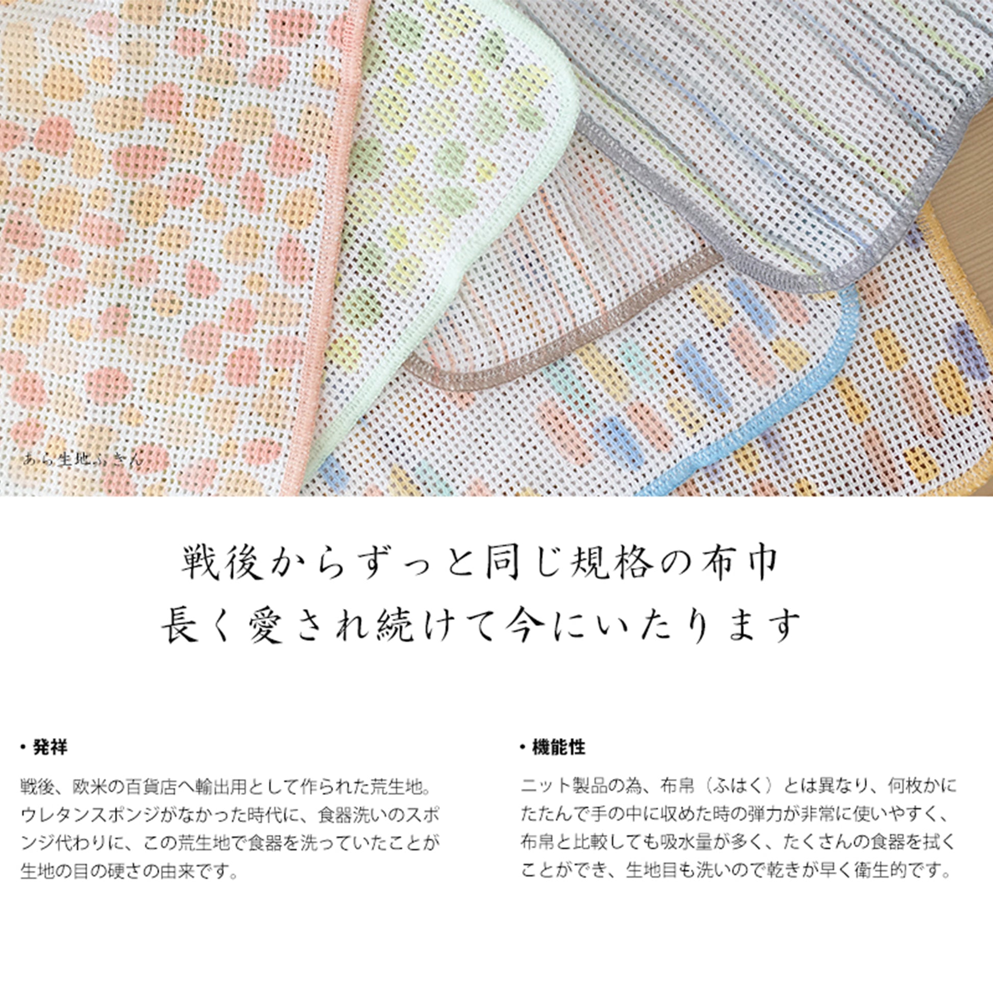 Being a knit product, it differs from woven fabrics (fuhaku) in that it is very easy to use when folded and held in the hand due to its elasticity. Compared to woven fabrics, it has a higher water absorption capacity, allowing for the efficient wiping of many dishes. Additionally, the fabric's coarse texture enables it to dry quickly, enhancing its hygienic properties.