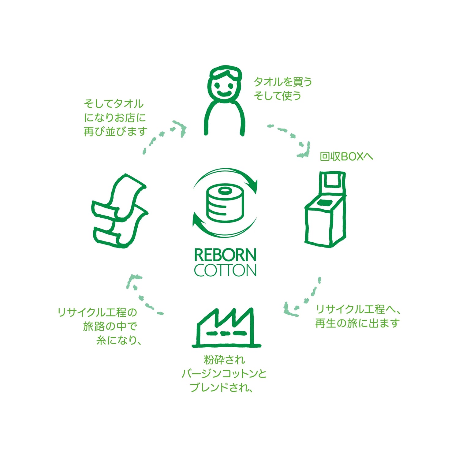 Reborn Cotton is made by mixing shorter yarns and old towels from the recycling manufacturing process with virgin cotton. The fluffy cotton provides a soft texture and excellent absorbency while reducing lint.