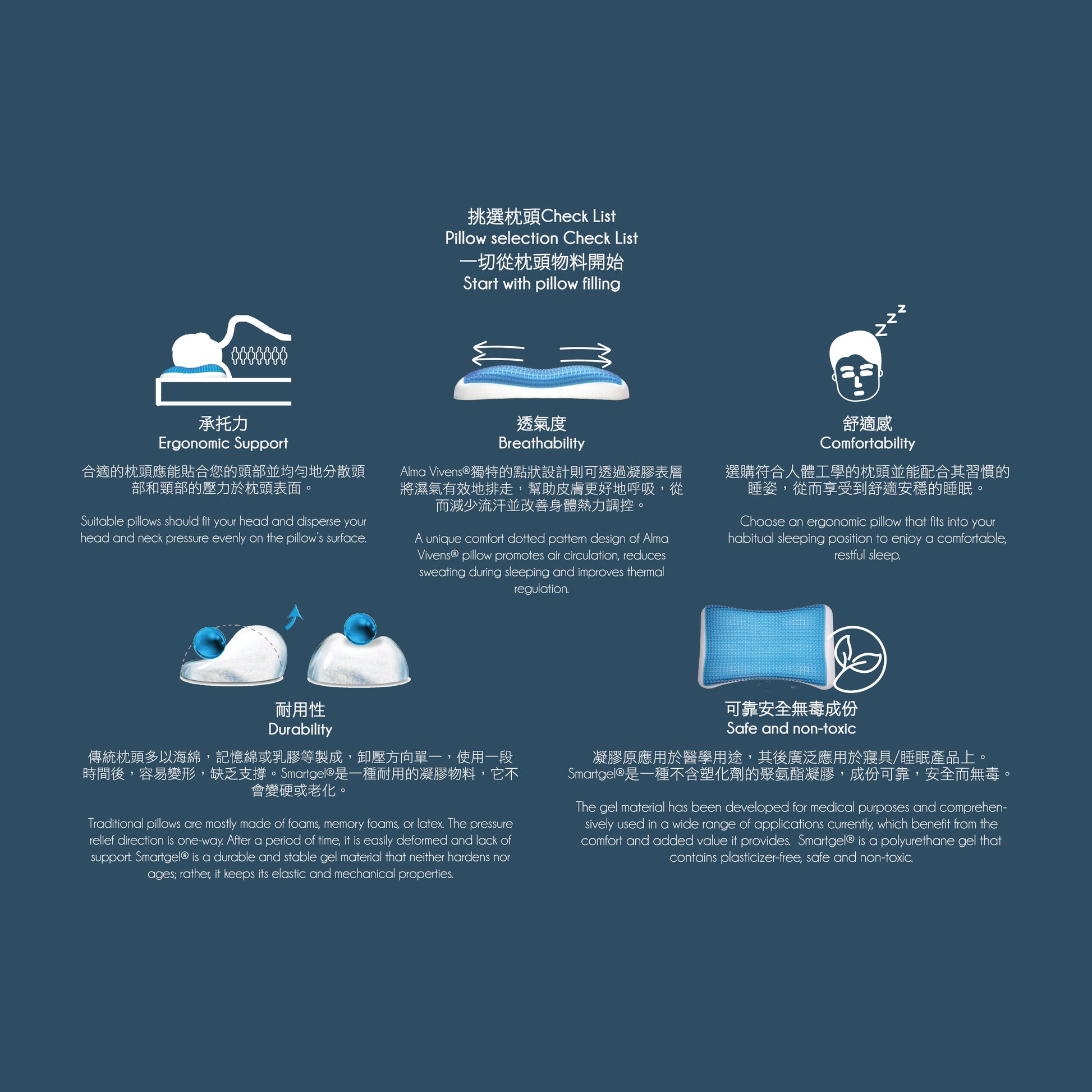 Alma Vivens® pillow is made by a stable Smartgel®, an unique dotted pattern design features a layer of Smartgel® molded seamlessly to memory foam that gently conforms and massage to your head and neck. It provides a better pressure relief and more extraordinary comfortable support.