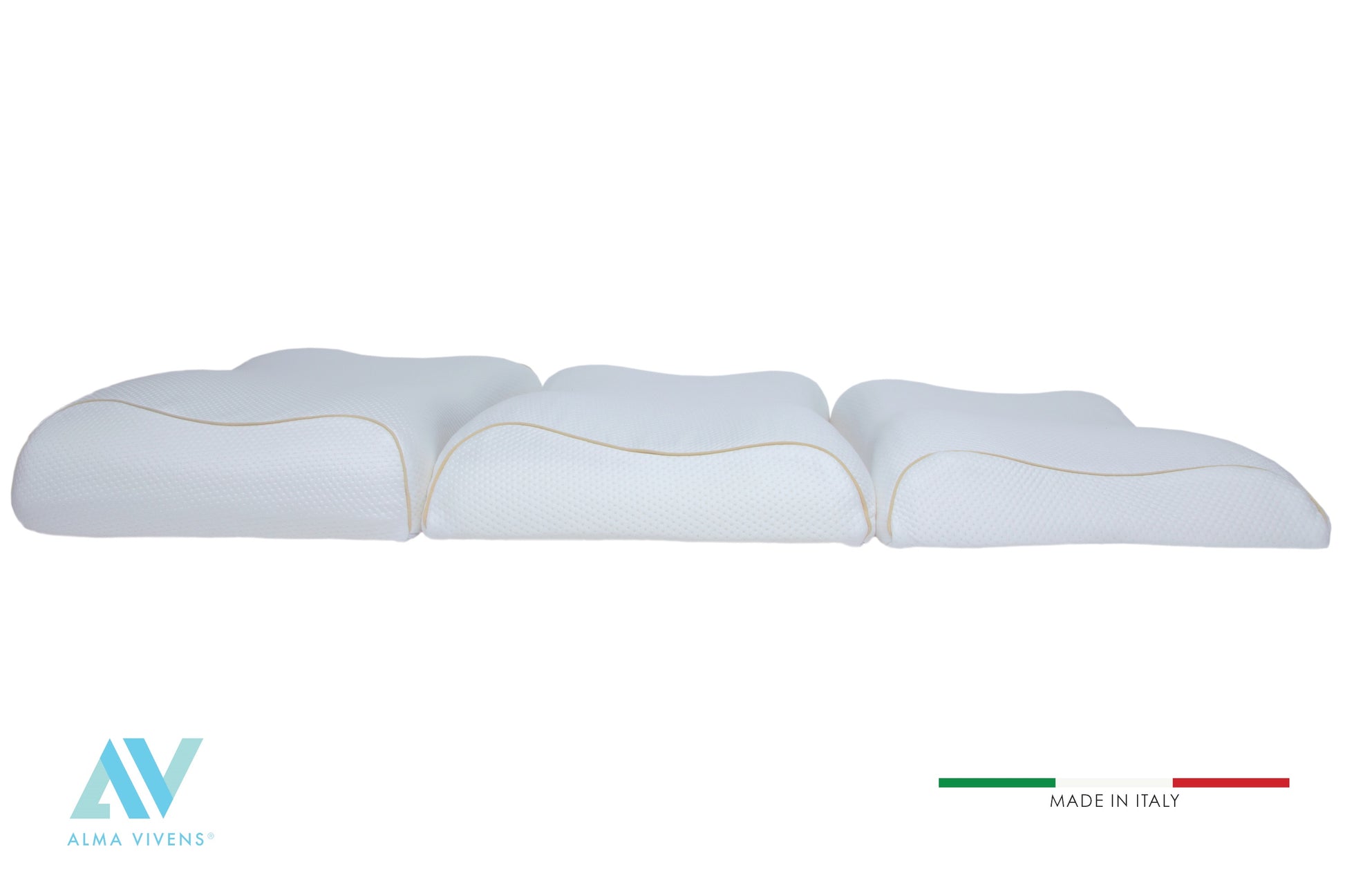 Alma Vivens® Premier pillows provide a better pressure relief and more extraordinary comfortable support to cope with different sleeping position. Specifically designed to meet the needs of those who suffer from neck, back and shoulder pain, this pillow model comes in three different heights and can optimize neck alignment for both side-sleepers and back sleepers thanks to its curved shape.
