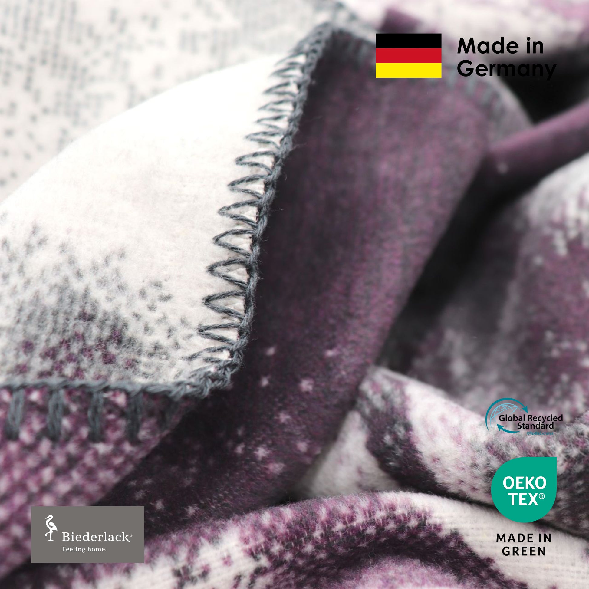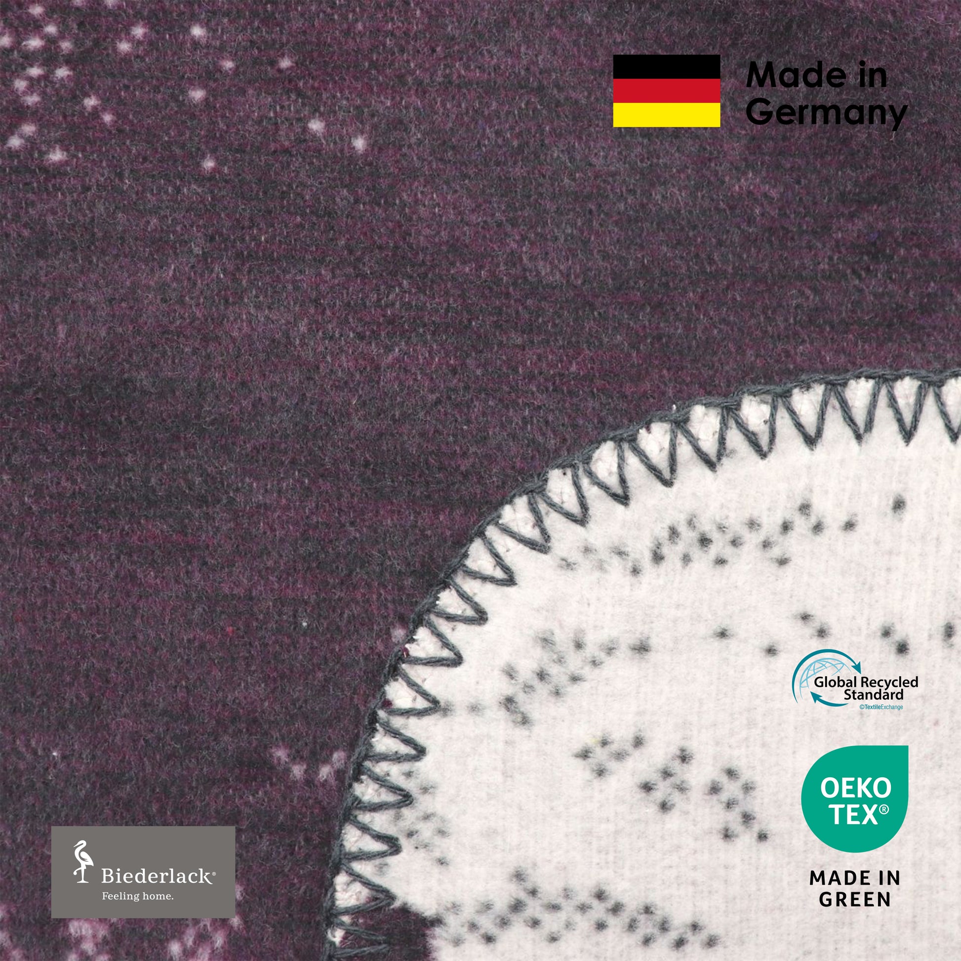 邊位以優雅鉤邊縫合,於德國 Greven 工廠人手縫製,色彩與圖案相互呼應。部分原料來自再生纖維,並通過 OEKO-TEX Made in Green 及全球回收標準(GRS)認證。