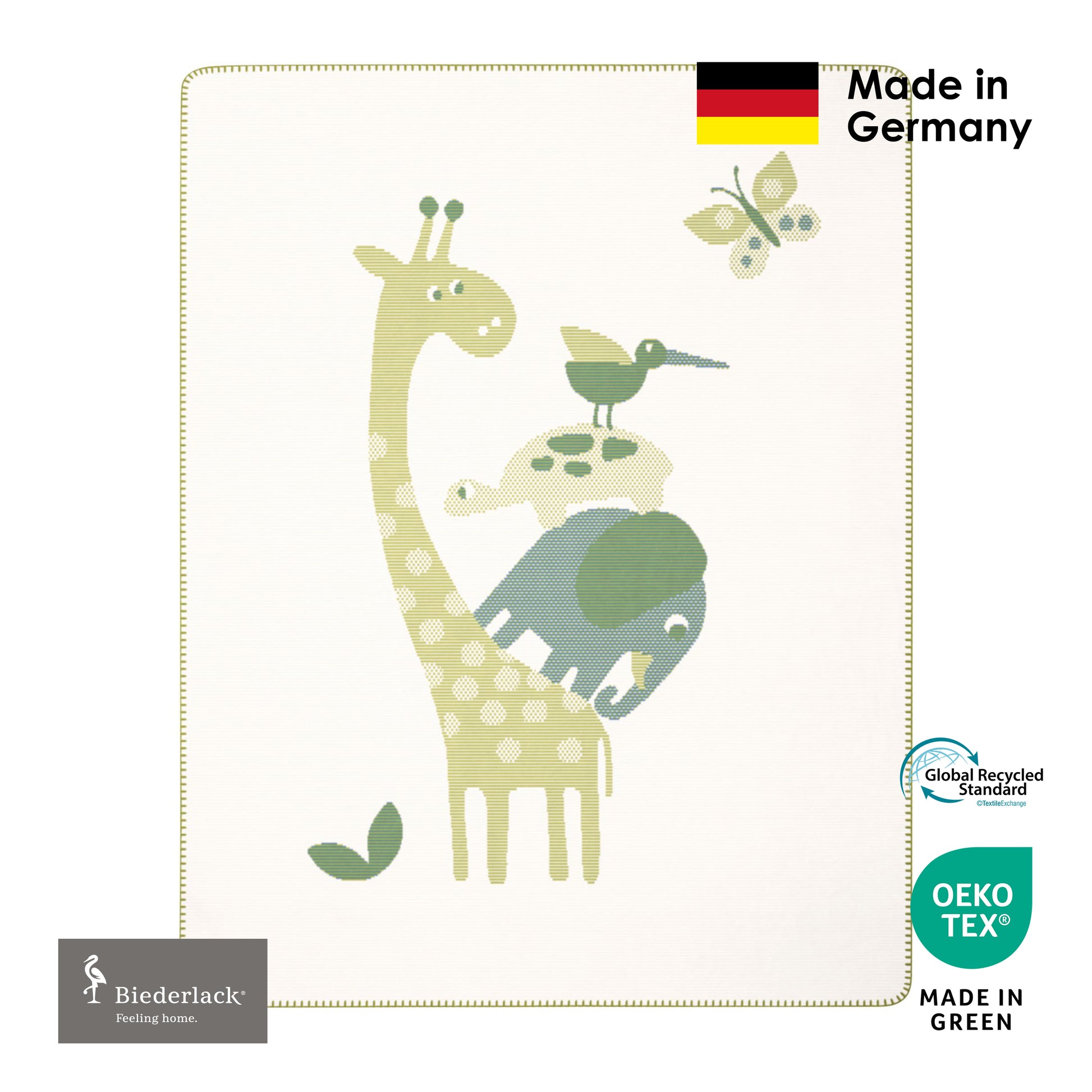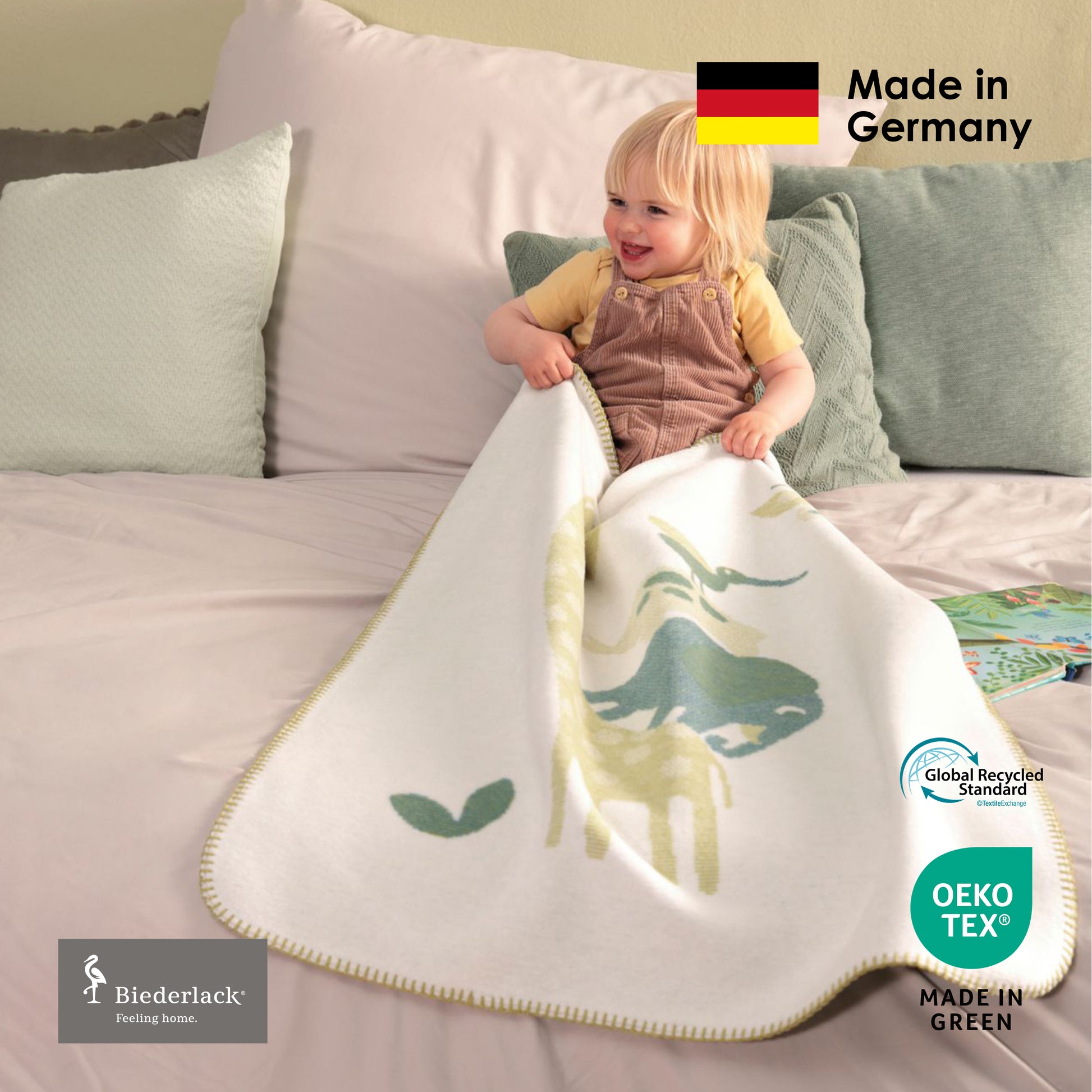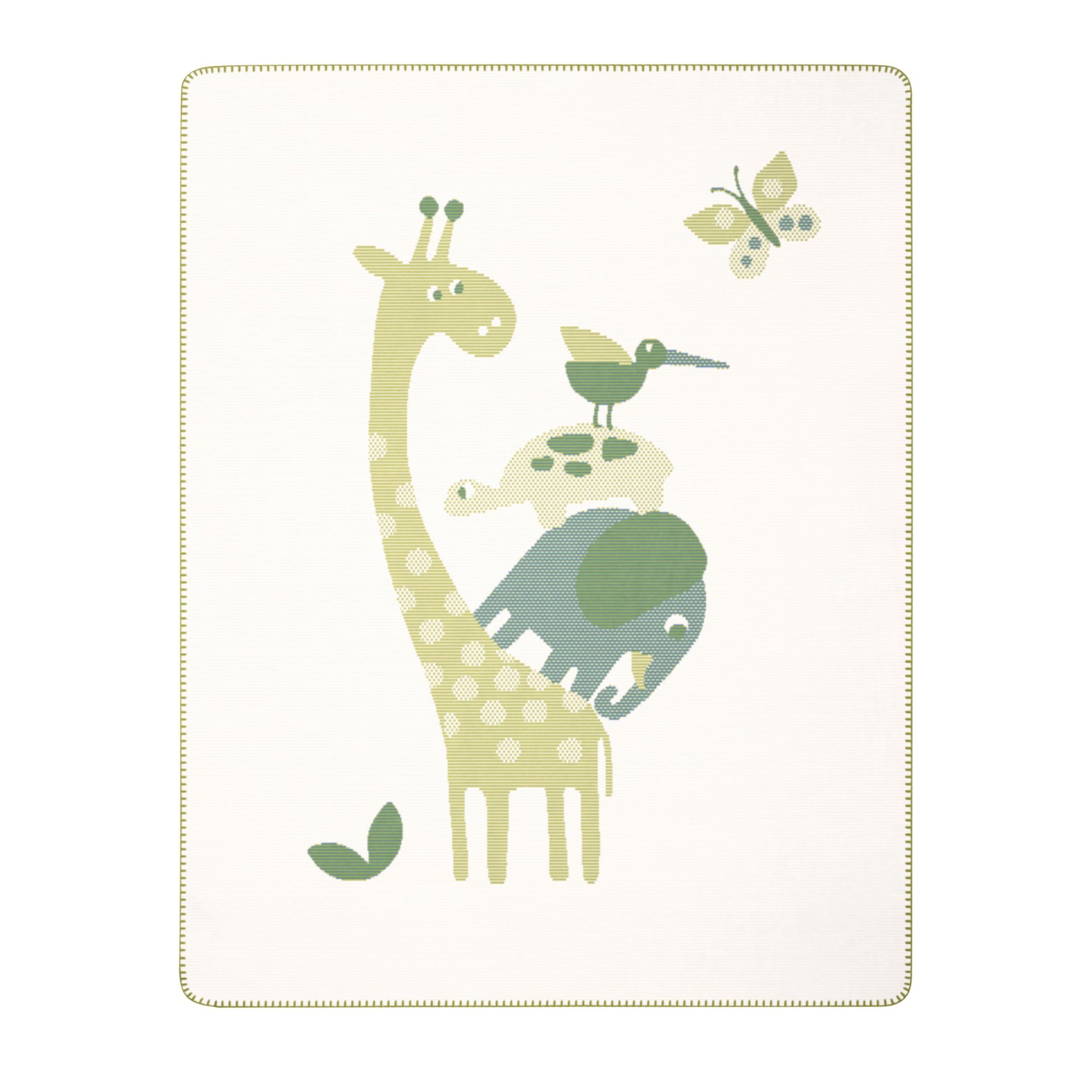 毛毯以高品質棉混紗(棉、腈綸及聚酯纖維)織造,保暖但不厚重,一年四季都適用。柔和的自然色調與粉彩搭配,營造輕鬆愉悅的氛圍,十分適合嬰兒房。