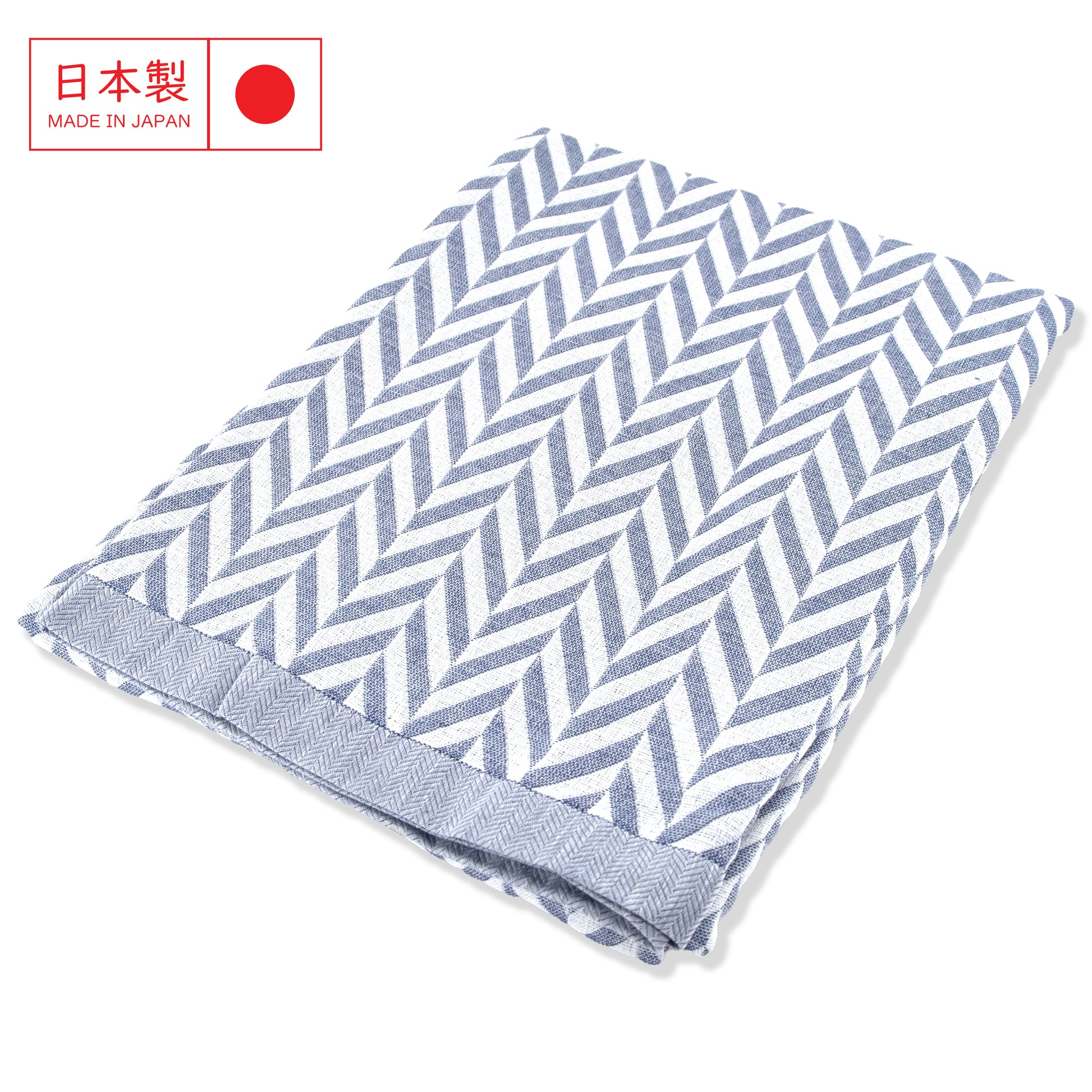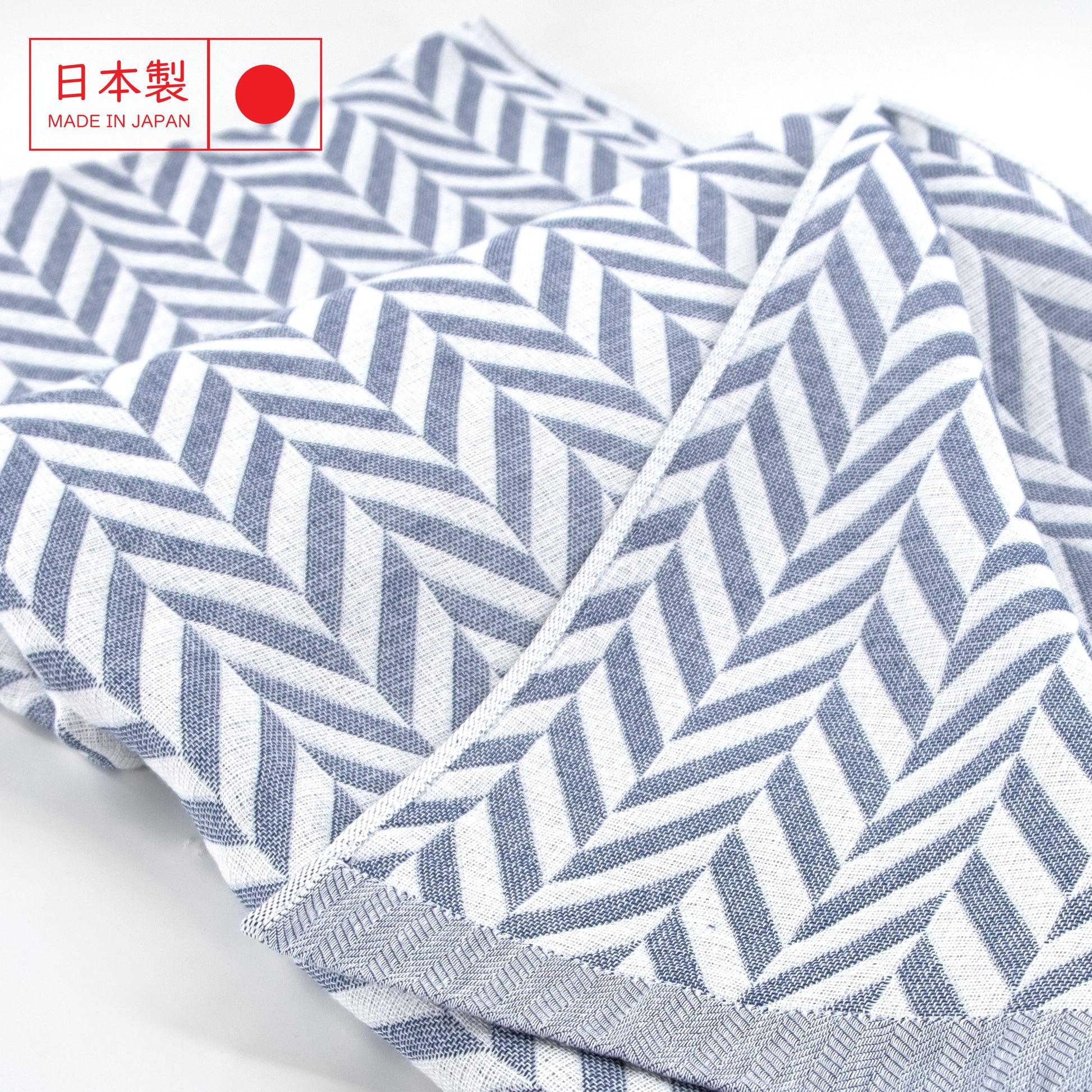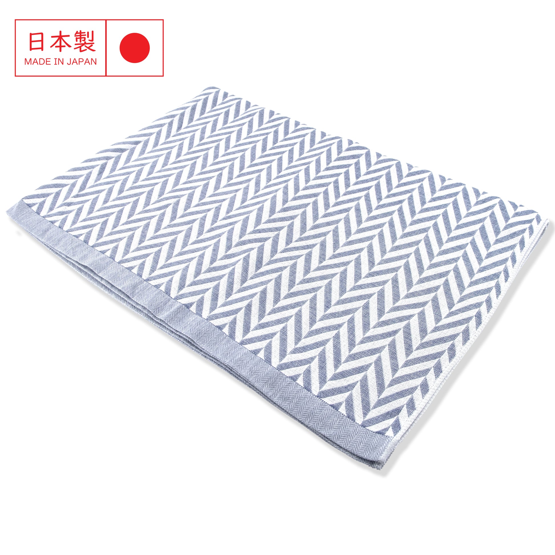 這款由日本今治出品的 人字紋純棉毛巾被,以柔和的藍色為主調,透過細膩的 提花織法呈現人字紋(Chevron) 圖案,展現日系簡約與居家質感的完美結合。
